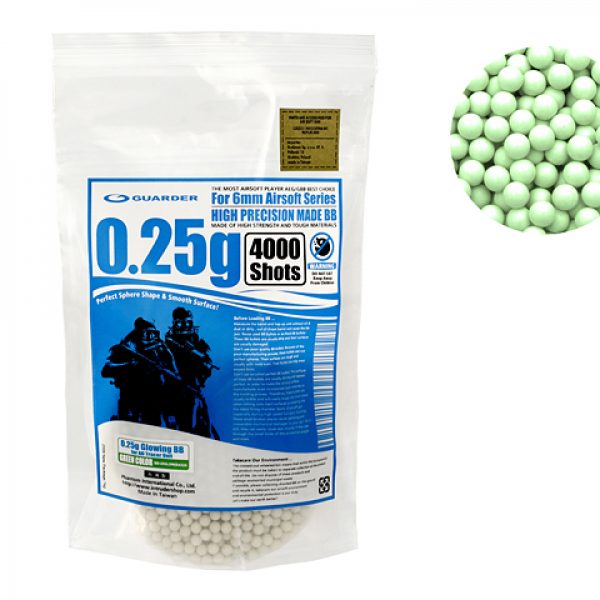 Precyzyjne kulki o wadze 0,25 g,świecące w ciemności, przeznaczone do AEG-ów oraz pistoletów gazowych. Po ich naświetleniu można śledzić ich tor lotu nawet całkowitych ciemnościach.Kulki GUARDER są bezkonkurencyjne pod względem jakości wykonania, uważane są za jedne z najlepszych na świecie. Można je stosować bez problemu w lufach precyzyjnych (zero zacięć!). Worek zawiera 4000 kulek.