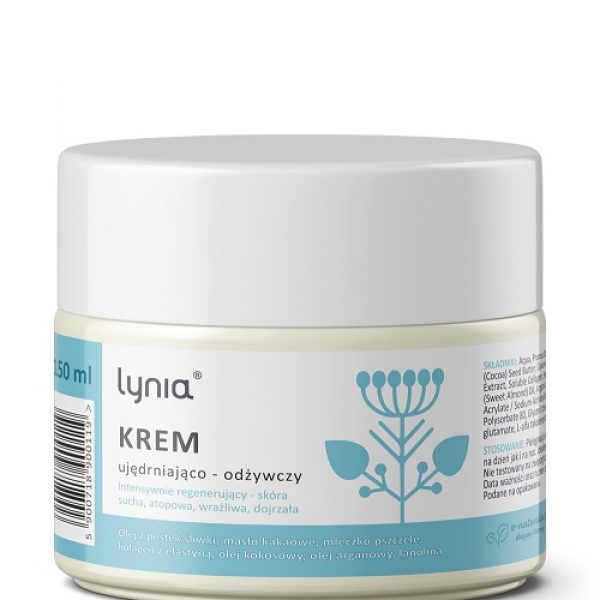 Lynia Krem Ujędrniająco-Odżywczy 150mlKrem do twarzy o właściwościach ujędrniająco-odżywczych. Intensywnie nawilża i regeneruje cerę. Posiada bogatą konsystencję, która oparta zotała o składniki nawilżające i wygładzające. Może być stosowana w przypadku każdego rodzaju skóry, w szczególności - atopowej, przesuszonej, odwodnionej i dojrzałej. Krem jest bardzo wydajny. Pojemność: 150ml