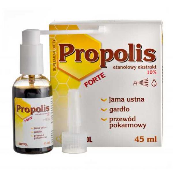PROPOLIS FORTE 10% - skład:Propolis, 70% spirytus etylowy.Zalecane spożycie:2 do 3 aplikacji skierować do jamy ustnej oraz na gardło, połknąć. Stosować również doustnie rozcieńczony roztwór preparatu do 20 kropli na 100 ml wody – 2 do 3 razy dziennie miedzy posiłkami.Przeciwwskazania:Nadwrażliwość na którykolwiek ze składników preparatu. W okresie ciąży i karmienia piersią przed zastosowaniem należy skonsultować się z lekarzem lub farmaceutą. Ważne informacje:Nie należy przekraczać zalecanej porcji do spożycia w ciągu dnia. Suplement diety nie może być stosowany jako substytut zróżnicowanej diety ani aktywnego trybu życia. Utrzymanie prawidłowego stanu zdrowia wymaga zrównoważonego i zróżnicowanego odżywiania i prowadzenia zdrowego trybu życia. Istnieje wiele czynników ryzyka choroby. Zmiana jednego z tych czynników ryzyka może wywierać korzystny wpływ lub nie wywierać go. Przechowywać w sposób niedostępny dla małych dzieci w temperaturze pokojowej. Osoby uczulone na produkty pszczele nie powinny stosować. Preparat zawiera 70% etanolu. Może osłabiać zdolność kierowania pojazdami mechanicznymi. Przeznaczony dla osób dorosłychPojemność opakowania:45 mililitrów.Producent:BARTPOL s.c.Brzoza 22 D64-553 Grzebienisko