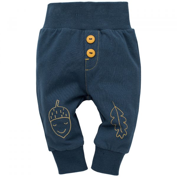 Granatowe legginsy niemowlęce w modnym kolorze granatowym, z ozdobnymi przeszyciami w kontrastowym kolorze curry. Na kolanach znajdują nadruki uśmiechniętego żołędzia i liścia. Szeroki, nieuciskający ściągacz w pasie zapewnia utrzymanie ubranka na swoim miejscu. Z przodu legginsów znajdują się dwa guziki, które imitują zapięcie. Odpowiedni krój zapewnia dziecku komfort noszenia i nie krępuje ruchów podczas codziennych aktywności. Legginsy można dowolnie łączyć ze innymi ubrankami z kolekcji Secret Forest, tworząc za każdym razem ciekawe stylizacje. To niezbędny element wyprawki każdego maluszka.Instrukcja prania: max. 40°C