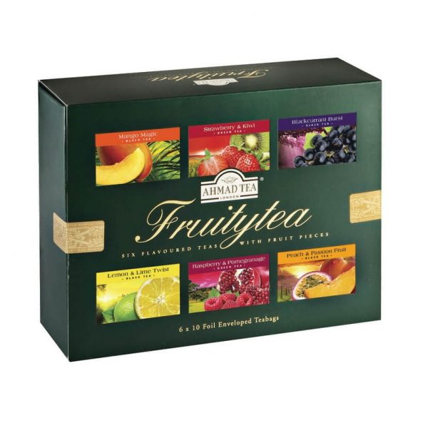 Ahmad Tea Selection of Fruit 6x10 kopert Opakowanie zawiera: 10x2g Ahmad Tea Mango Magic 10x2g Ahmad Tea Strawberry&Kiwi 10x2g Ahmad Tea Blackcurrant Burst 10x2g Ahmad Tea Lemon & Lime Twist 10x2g Ahmad Tea Raspberry & Pomegranage 10x2g Ahmad Tea Peach & Passion Fruit