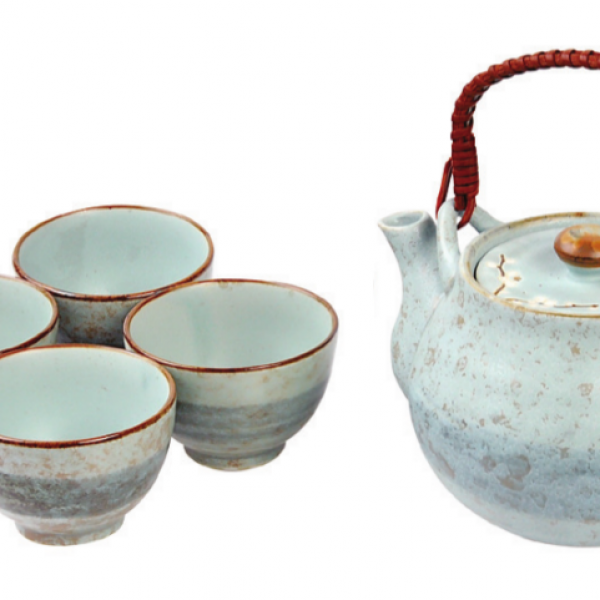 Kamionkowy błękitny japoński zestaw do herbaty dla 4 osób. Komplet jest dekorowany orientalnym motywem kwiatu wiśni. Całość prezentuje się minimalistycznie i elegancko.Komplet składa się z:dzbanka: 600 ml4 czarek: 85 ml