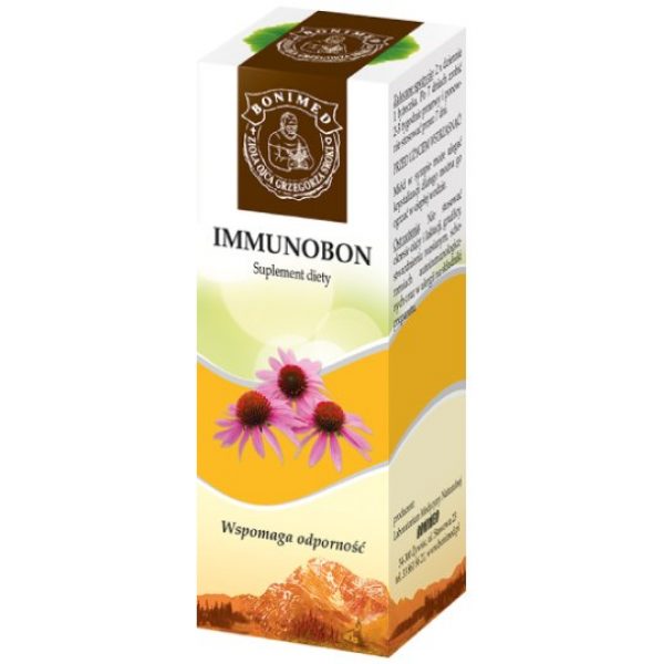 BONIMED Immunobon syrop - właściwości:Właściwości niektórych substancji:Witamina C - pomaga w utrzymaniu prawidłowego funkcjonowania układu odpornościowego.BONIMED Immunobon syrop - skład:Miód pszczeli*, sacharoza, woda, ekstrakt z ziela jeżówki purpurowej, ekstrakt z liścia melisy lekarskiej, ekstrakt z kwiatu rumianku pospolitego, witamina C (kwas L-askorbinowy) z ekstraktu z owoców róży, substancje konserwujące: sorbinian potasu, benzoesan sodu.2 łyżeczki (ok. 14 g) zawiera:Miód pszczeli* 7 g, Ekstrakt z ziela jeżówki purpurowej 0,41 g, Ekstrakt z liścia melisy lekarskiej 0,22 g, Ekstrakt z kwiatu rumianku pospolitego 0,14 g, Ekstrakt z owoców róży w tym witamina C (kwas L-askorbinowy) 57 mg (71% ZDS**).* Miód nektarowy, wielokwiatowy**ZDS - zalecane dzienne spożycie.BONIMED Immunobon - zalecane spożycie:2 łyżeczki (2 razy dziennie po 1 łyżeczce).Po 7 dniach zrobić 2-3 tygodnie przerwy i ponownie stosować przez 7 dni. Powyższy cykl można powtarzać co 2-3 miesiące. Poniżej 6. roku życia stosować 2 razy dziennie po pół łyżeczki preparatu. Dawkowanie poniżej 3. roku życia skonsultować z lekarzem.Przeciwwskazania:Nie stosować w okresie ciąży i laktacji, gruźlicy, stwardnieniu rozsianym, schorzeniach autoimmunologicznych oraz w alergii na składniki preparatu.Ważne informacje:Nie należy przekraczać zalecanej porcji do spożycia w ciągu dnia. Suplement diety nie może być stosowany jako substytut zróżnicowanej diety ani aktywnego trybu życia. Utrzymanie prawidłowego stanu zdrowia wymaga zrównoważonego i zróżnicowanego odżywiania i prowadzenia zdrowego trybu życia. Istnieje wiele czynników ryzyka choroby. Zmiana jednego z tych czynników ryzyka może wywierać korzystny wpływ lub nie wywierać go. Miód w preparacie może ulegać krystalizacji, dlatego można go ogrzać w ciepłej wodzie. Przechowywać w zamkniętym opakowaniu w temp. poniżej 25 st. C, w miejscu suchym i niedostępnym dla małych dzieci. Chronić przed promieniami słonecznymi. Po otwarciu przechowywać w lodówce.Miód w preparacie może ulegać krystalizacji, dlatego można go ogrzać w ciepłej wodzie.Pojemność opakowania:100 mililitrów / 130 gram.Producent:Laboratorium Medycyny Naturalnej BONIMEDul. Stawowa 2334-300 Żywiec