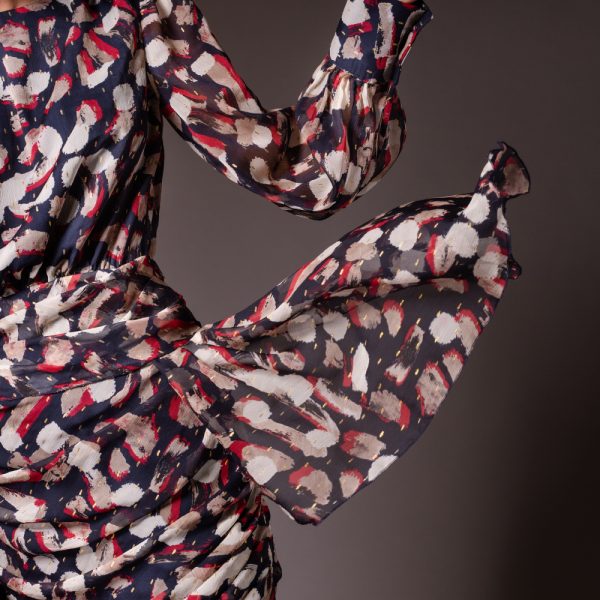 Zjawiskowa sukienka z czarnym tłem inspirowana sztuką POLLOCKA z charakterystycznym kapaniem farbą na płótno tzw. action paiting. Linia spódnicy marszczona na lini bioder nadająca przestrzenna formę , szeroka lina rękawów i wysoki mankiet nadaje lekkości podkreślając znamiennie lekko odsłoniętą linię pleców. Zapinana na zatrzaski lina boczna projektu dopełnia go niecodziennym rozwiązaniem dając ukłon w stronę sztuki. Model na zintegrowanej podszewce. skład: 100% wiskoza długość całkowita : 98 cm modelka ma 178 cm wzrostu i ma na sobie rozmiar 36