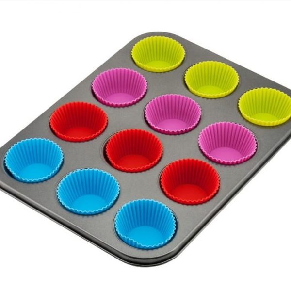 Blaszka do pieczenia babeczek. W blaszce znajduje się miejsce na 12 szt. W zestawie znajdują się wkłady silikonowe wielokrotnego użytku.