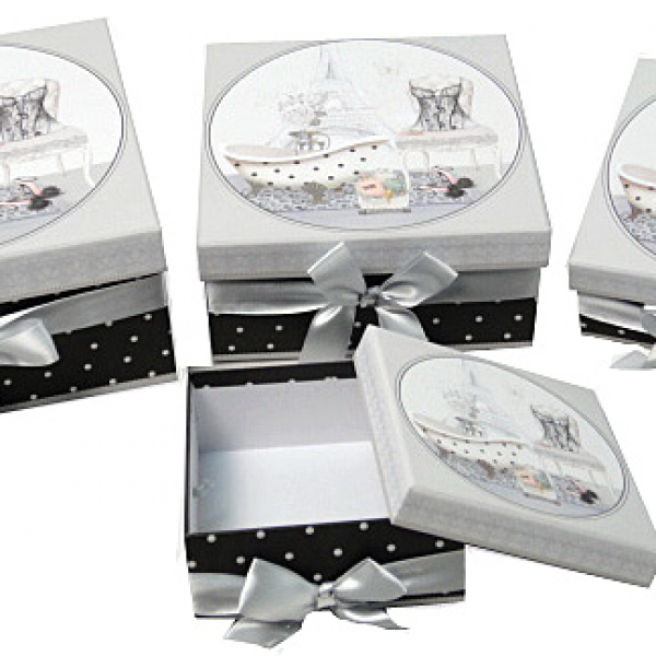 Niezwykle praktyczne i nie do zastąpienia pudełka papierowe, nie tylko ułatwią przechowywanie twojej biżuterii ale także będą ozdobą każdego pomieszczenia. l.p. długość=szerokość wysokość 1 23 cm 12 cm 2 20 cm 9,5 cm 3 17 cm 8 cm 4 14 cm 6 cm