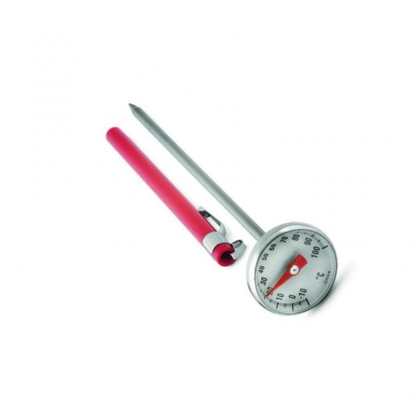 Termometr do mierzenia temperatury pieczonego mięsa, a także innych potraw lub napojów, np. mleka czy wody. Wyposażony w skalę od 0°C do 100°C. Temperaturę należy mierzyć po wyjęciu pieczeni z piekarnika, nie należy umieszczać termometru w piekarniku ani w kuchence mikrofalowej! Do termometru jest dołączona praktyczna osłona, zabezpieczająca podczas przechowywania ostry szpikulec. Wymiary termometru to: długość 13 cm średnica 3 cm Główne zalety: długi, ostry szpikulec zapewnia kontrolę nad pieczonym mięsem, a także temperaturą cieczy pomiar w stopniach Celsjusza osłona zabezpieczająca na czas przechowywania wykonany ze stali nierdzewnej, szkła oraz tworzywa sztucznego 2 lata gwarancji