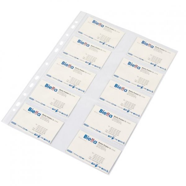 obwoluta krystaliczna miękka, wykonana z gładkiej ekologicznej folii polipropylenowej (50um) przeznaczona na 10 jednostronnie lub 20 dwustronnie umieszczonych kart wizytowych przezroczysta specjalny wzmocniony brzeg koszulki pasek z multiperforacją dziurkowanie: 11 kieszonki mieszczą wizytówki o rozmiarach do 95x60 mm wymiary zewnętrzne: 305x235 mm 10 sztuk w opakowaniu BIE/1716001PL-00