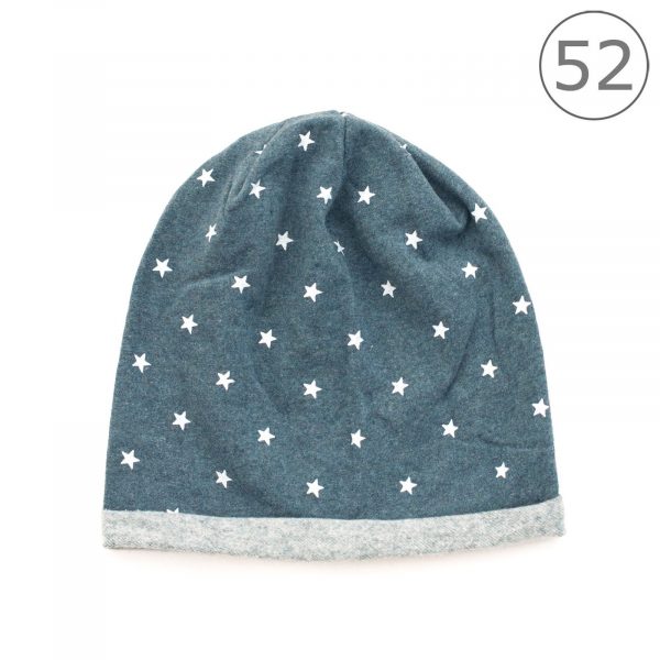 Dziecięca czapka w fasonie beanie. Ozdobiona nadrukiem w gwiadki. Delikatnie rozciągliwa, w środku ocieplona milutkim meszkiem. Ta czapka świetnie sprawdzi się w czasie pierwszych chłodów.