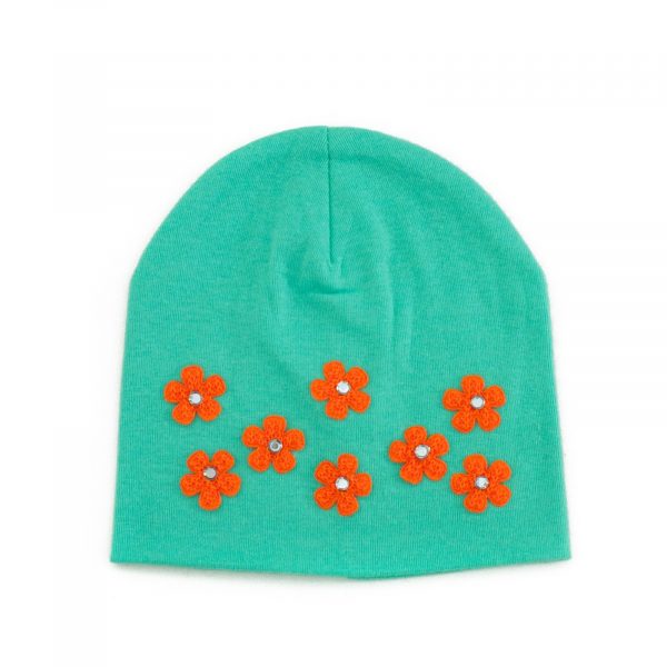 Urocza dziecięca czapka ozdobiona kwiatuszkami. Wykonana z miękkiego, podwójnego materiału. Jest rozciągliwa. Ta czapka łączy w sobie komfort noszenia oraz stylowy dziewczęcy design.
