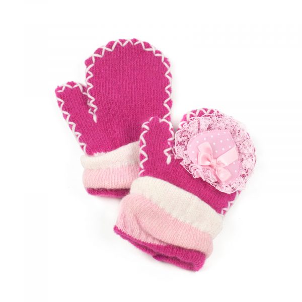 Dziecięce rękawiczki jednopalczaste z naszywką z serduszkiem obszytym koronką. Połączone sznurkiem, dzięki czemu Twoje dziecko nie zgubi ich podczas spaceru. Przeznaczone dla dzieci w wieku 1-3 lat.