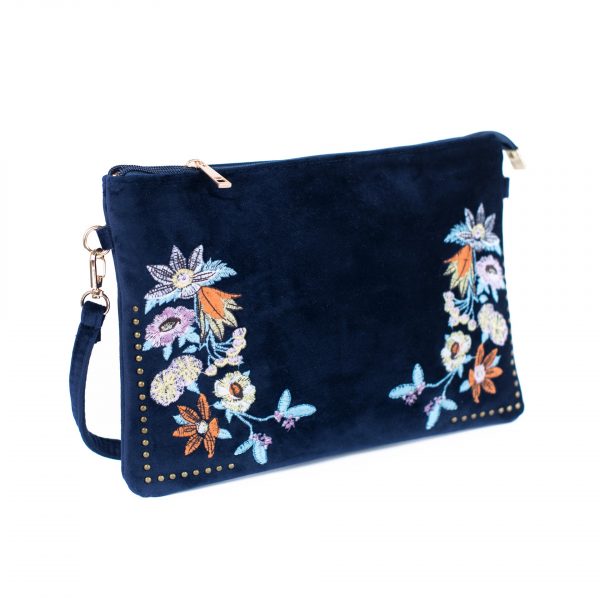 Welurowa kopertówka ozdobiona haftami i miedzianymi dżetami. Zapinana na zamek, posiada odpinany i regulowany pasek. Wewnątrz ma małą kieszeń zapinaną na zamek. Idealny dodatek do odświętnych, kobiecych stylizacji.