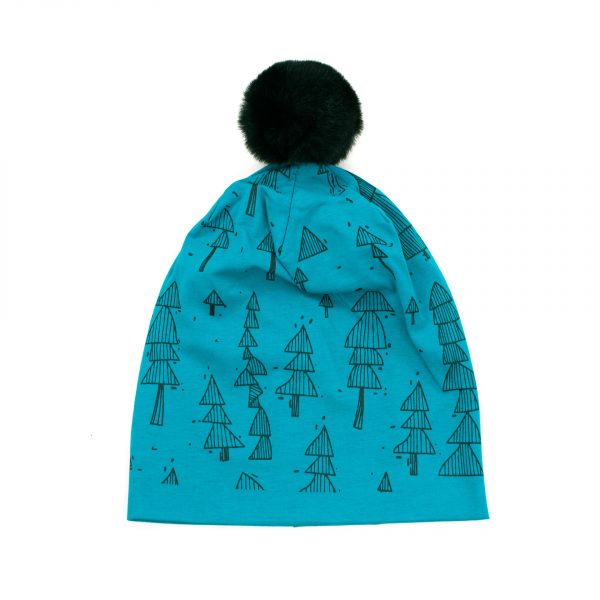 Urocza czapka z puszystym pomponem. Ozdobiona motywem leśnym. Wykonana z miłego w dotyku, podwójnego dresowego materiału. Jest lekko rozciągliwa, dobrze przylega do głowy. Ta leśna czapka przypadnie do gustu wszystkim małym zdobywcom świata.