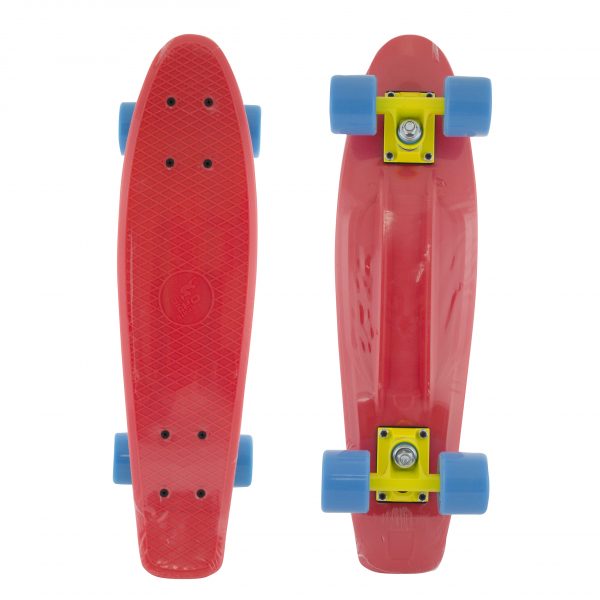 kolorystyka: deck czerwony; trucki żółte; kółka niebieskie