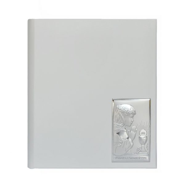 Album na komunie dla dziewczynki z posrebrzanym obrazkiem na okładce, wielkości 6,5 x 11 cm