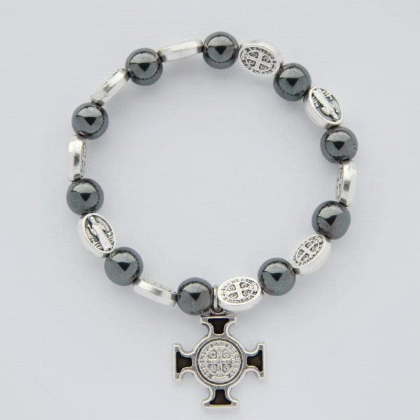 Bransoletka składa się z koralików wykonanych z hematytu oraz z medalików i krzyża św. Benedykta. Medaliki św. Benedykta wykonane są z metalu.