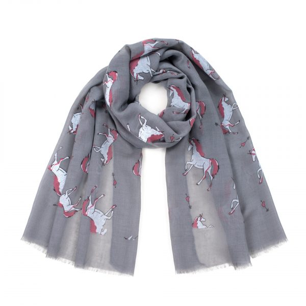 Uroczy dziecięcy szal w jednorożce. Wykonany z wiskozy, jest miękki i przewiewny. Wykończony delikatnymi frędzelkami. Ten magiczny szal stanie się ulubieńcem każdego dziecka.