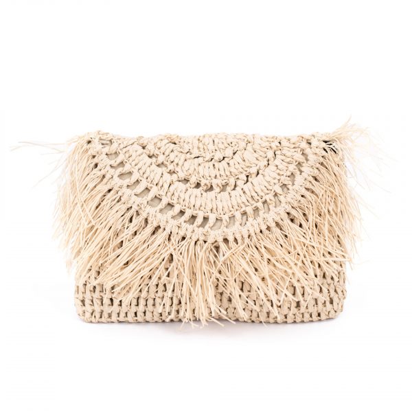 Pięknie pleciona torebka z klapką zakończoną frędzlami. Wewnątrz podszewka. Regulowane ucho z ekoskóry. Torebka została wykonana z naturalnych materiałów. Zamykana na zamek. Pomieści wszystkie niezbędne drobiazgi. Doda lekkości każdej stylizacji. Ten uroczy dodatek pokochają miłośniczki zwiewnego, dziewczęgo stylu.