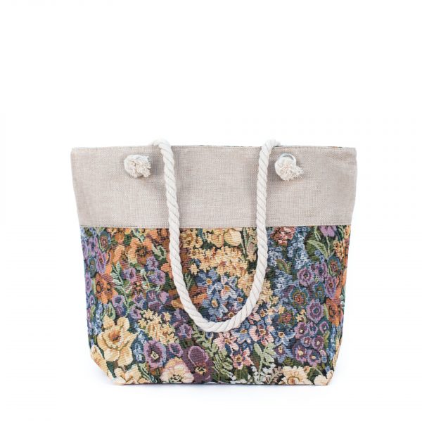 Duża torba plażowa ozdobiona motywem kwiatowym. Zamykana na zamek. Wewnątrz podszewka oraz kieszonka na drobiazgi. Uszy wykonane z grubego marynarskiego sznura. Torebka jest bardzo pakowna - sprawdzi się nie tylko jako codzienny dodatek, ale i jako torba na zakupy. Doda letniego klimatu codziennym stylizacjom.