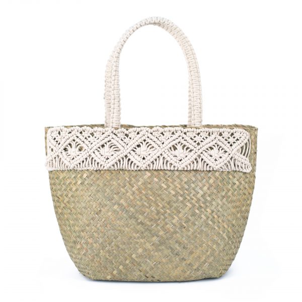 Wyjątkowy koszyk wykonany z trawy morskiej. Ozdobiony bawełnianą makramą. Uszy pozwalają na noszenie w ręce lub na ramieniu. Wewnątrz bawełniana podszewka oraz mała kieszonka. Koszyk mieści rozmiar A4 i jest zapinany na zamek. Będzie pasował zarówno do letnich sukienek, jak i szortów czy jeansów. Ten stylowy dodatek będzie idealnym towarzyszem wypadów na miasto czy plażę.
