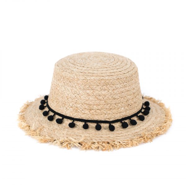 Dziecięcy kapelusz z fantazyjnymi pomponikami i postrzępionym rondem. Wykonany z naturalnych materiałów. Posiada wewnątrz regulację rozmiaru. Produkt handmade.