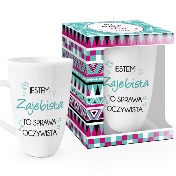 Ceramiczny biały kubek z sentencją Jestem zajebista, to sprawa oczywista. Zdobiony zabawnymi nadrukami w modnych kolorach, idealnie sprawdzi się jako prezent dla przyjaciółki lub innej bliskiej osoby. Zapakowany w ozdobne, barwne pudełko. Dzięki temu kubkowi poranna kawa to czysta przyjemność !Pojemność: 400 ml.