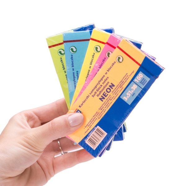 Uniwersalne kolorowe karteczki, idealne do przekazywania wiadomości Ilość karteczek: 3x100 w rozmiarze 38x51mm Gramatura: 70gsm (+/- 4%) Klej umieszczony wzdłuż dłuższego boku Klej usuwalny za pomocą wody Posiada oznaczenie Zielony Punkt" (Der Grüne Punkt) - oznaczający udział w systemie recyklingu systemie recyklingu i odzysku odpadów wynikający z przepisów prawa polskiego i UE Dostępne kolory: żółty, zielone, niebieskie,pomarańczowe, różowe 3 szt. zabezpieczone folią z charakterystycznym czerwonym paskiem ułatwiającym otwieranie