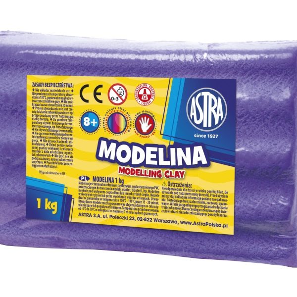 Modelina jest wysokiej jakości termoutwardzalnym tworzywem plastycznym, przeznaczonym do zabawy i nauki w szkołach, pracowniach plastycznych oraz w domu Doskonale nadaje się do tworzenia modeli oraz makiet Z modeliny można także wyrabiać drobną galanterię: klipsy, broszki, breloczki. Modelina ASTRY posiada właściwości umożliwiające łatwe modelowanie w dłoniach i tworzenie dowolnych kształtów o żywych i trwałych kolorach Modele można wykonywać ręcznie lub przez wyciskanie wzorów w formach Twarda modelina mięknie pod wpływem ciepła dłoni lub innych źródeł ciepła z zachowaniem bezpiecznego czasu ogrzewania Gotowe modele należy umieścić w naczyniu z ciepłą wodą i stopniowo podgrzewać ją do temperatury 95°C przez około 10-15 minut Modele można także utwardzać przez wygrzewanie w piekarniku w temperaturze 100-140°C w ciągu 10-15 minut Utwardzanie w temperaturze powyżej 140°C i w czasie dłuższym niż 30 minut może spowodować zwęglenie modeliny Gotowe modele posmarowane olejem roślinnym nabierają żywszych barw Waga: 1kg