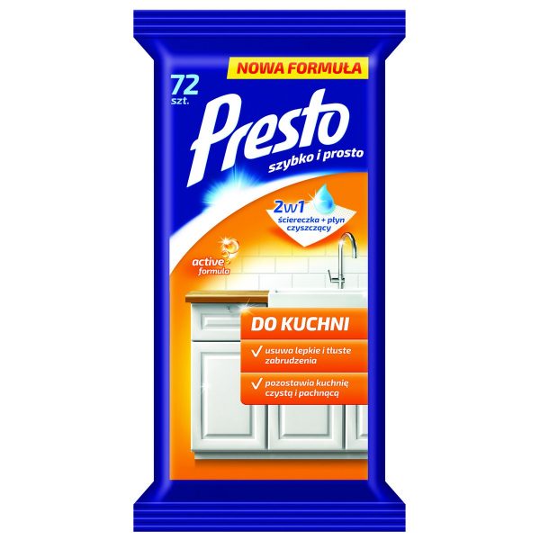 Ściereczki nawilżane Presto do kuchni przeznaczone sa do czyszczenia szafek i blatów, okapów oraz baterii kuchennych Skutecznie usuwaja tłuste i lepkie zabrudzenia dzieki zastosowaniu specjalnie dobranej kompozycji aktywnych substancji czyszczacych Ułatwiaja kolejne mycie poprzez zastosowanie polimeru wnikajacego w pory powierzchni i zabezpieczają ja przed wchłanianiem brudu Pozostawiają lsniącą powierzchnie bez smug dzięki zawartosci składnika przyspieszajacego schnięcie Zapewniaja przyjemny, odswieżający zapach Nie podrażniają skóry dłoni 72 ściereczki w opakowaniu