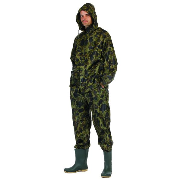 Ubranie ochronne: spodnie do pasa oraz kurtka z kapturem Wykonane w 100% z poliestru Powłoka wodoodporna wykonana z PVC Podklejone szwy Kaptur chowany w kołnierzu Praktyczne opakowanie Do prac: w budownictwie, w rolnictwie, w rybołówstwie, w czasie wolnym, do ogólnego zastosowania Rozmiar: XL Kolor moro