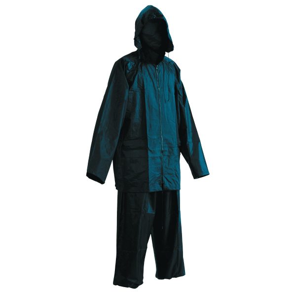 Ubranie ochronne: spodnie do pasa oraz kurtka z kapturem Wykonane w 100% z poliestru Powłoka wodoodporna wykonana z PVC Podklejone szwy Kaptur chowany w kołnierzu Praktyczne opakowanie Do prac: w budownictwie, w rolnictwie, w rybołówstwie, w czasie wolnym, do ogólnego zastosowania Rozmiar: XXL Kolor niebieski